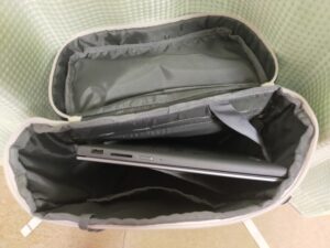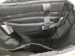 開けると背中側の内側は、見ずらいのですが、ノートやパソコン(15インチ以下)を入れられるマジックテープ付きの簡単なポケットがあります。