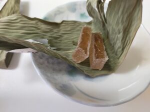 味がはっきりせず、少し甘い硬い寒天のお菓子でした。