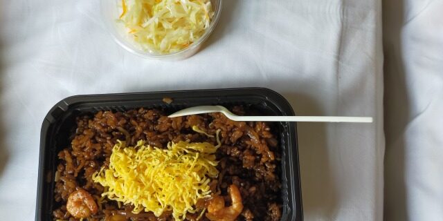 エビが入ったチャーハンのような感じで、味は、ソース味、ちょっぴりカレー味の今まで食べたことのないお味で、私は、おいしかったです。